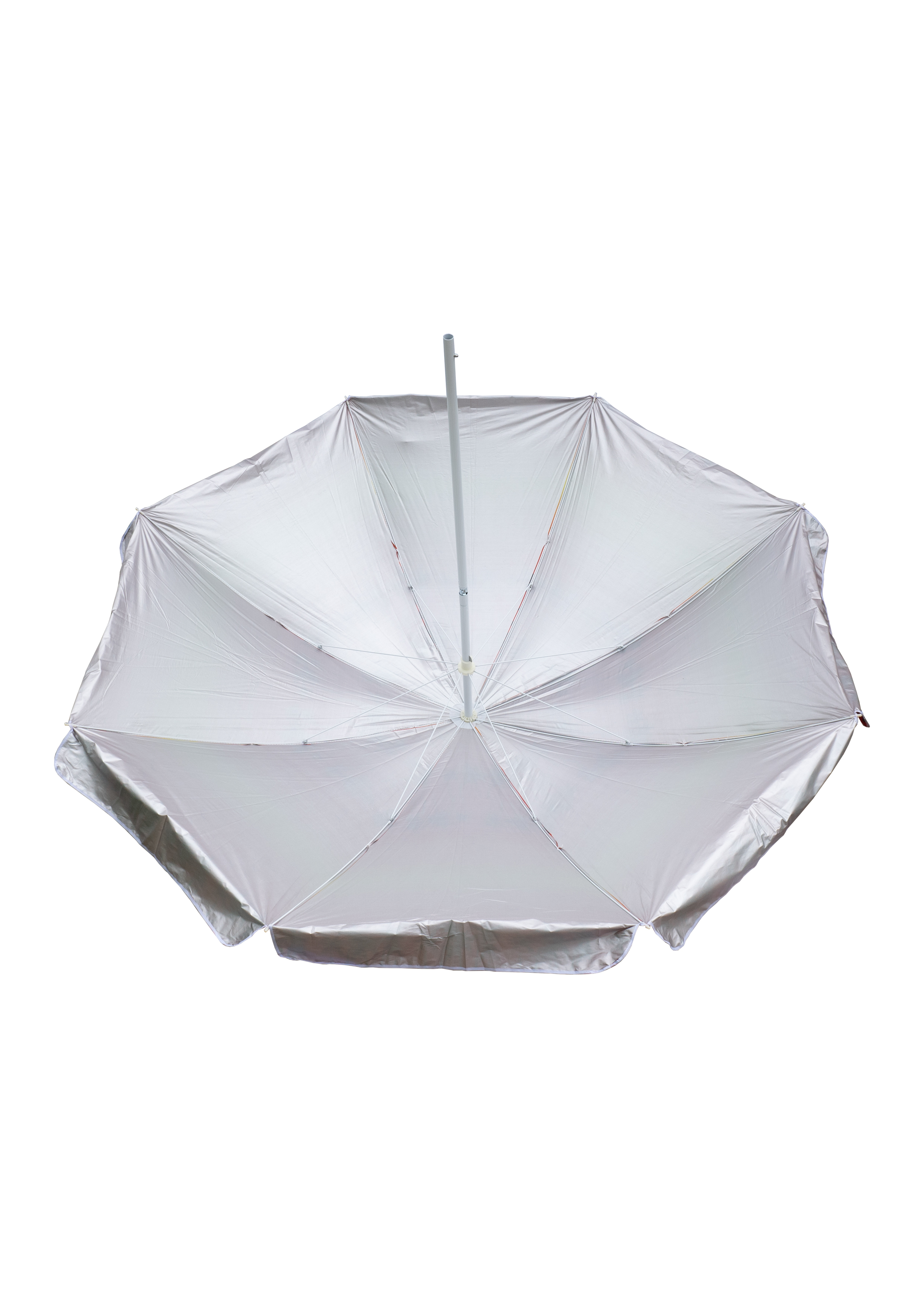Зонт пляжный фольгированный (150 см в диаметре) 12шт/упак - надежное укрытие от солнечных лучей. Качественный металлический карскас с наклоном. Купол пляжного зонта выполнен из водонепроницаемого полиэстера, с внутренней стороны купол фольгирован, поэтому солнечные лучи отражаются. В раскрытом виде размер купола 1,5 метра. В ассортименте 4 расцветки